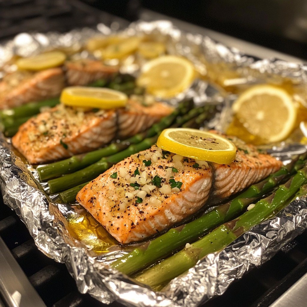 Grillad lax med citron, vitlök och sparris i folie